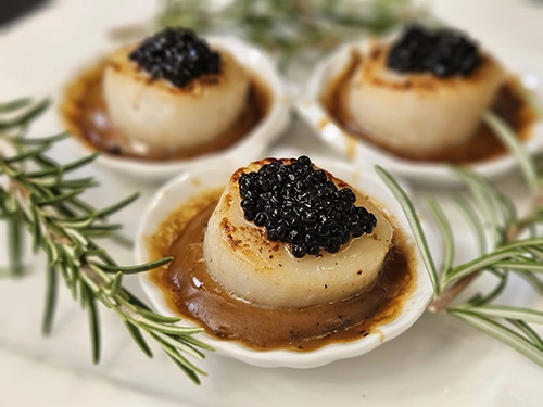 Dans un petit ramequin légèrement chaud verser 1 a 2 cuillère de sauce. déposer dessus une noix saint Jacques rôtie et décorez avec une petite cuillère de perles de truffes juste posée dessus.